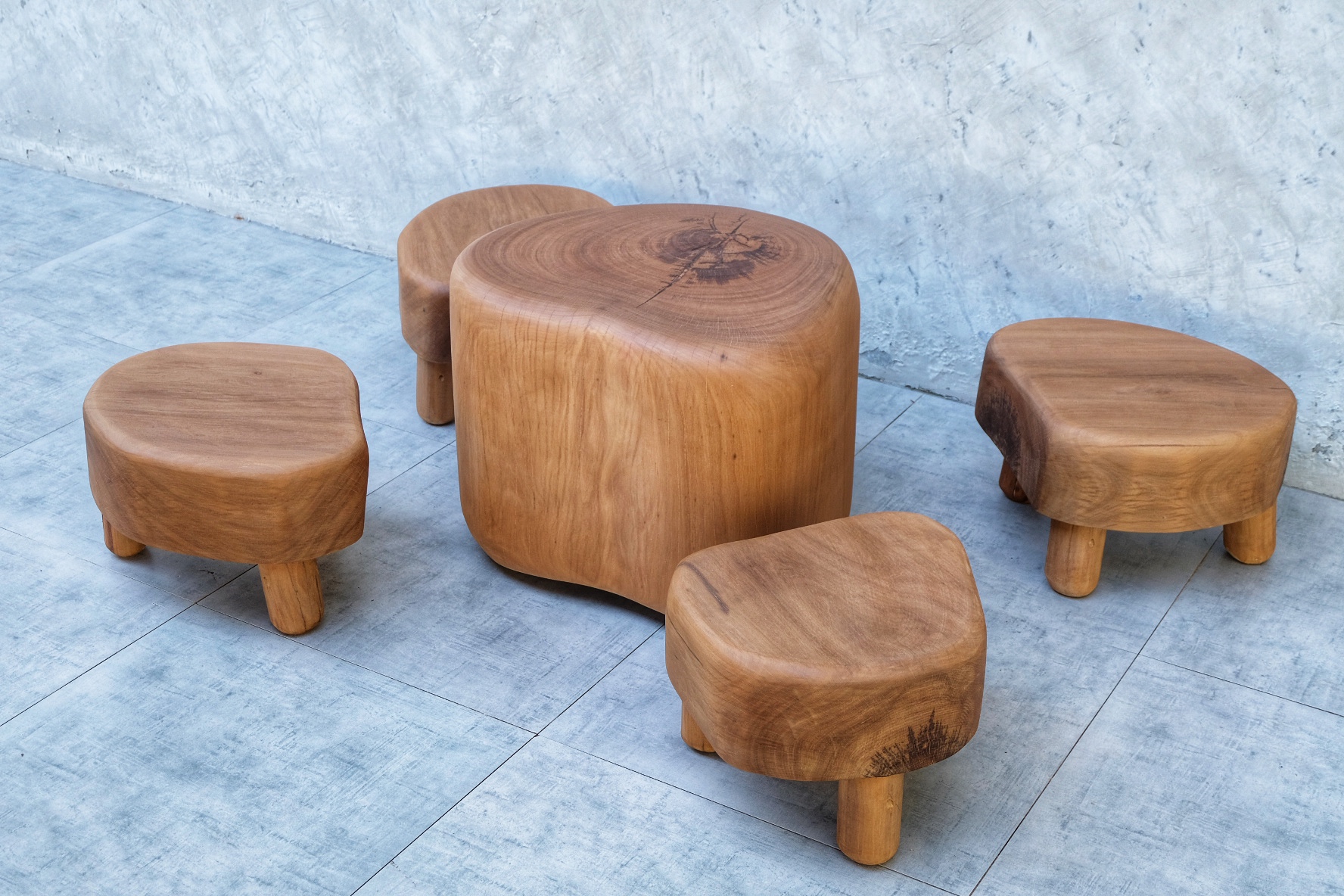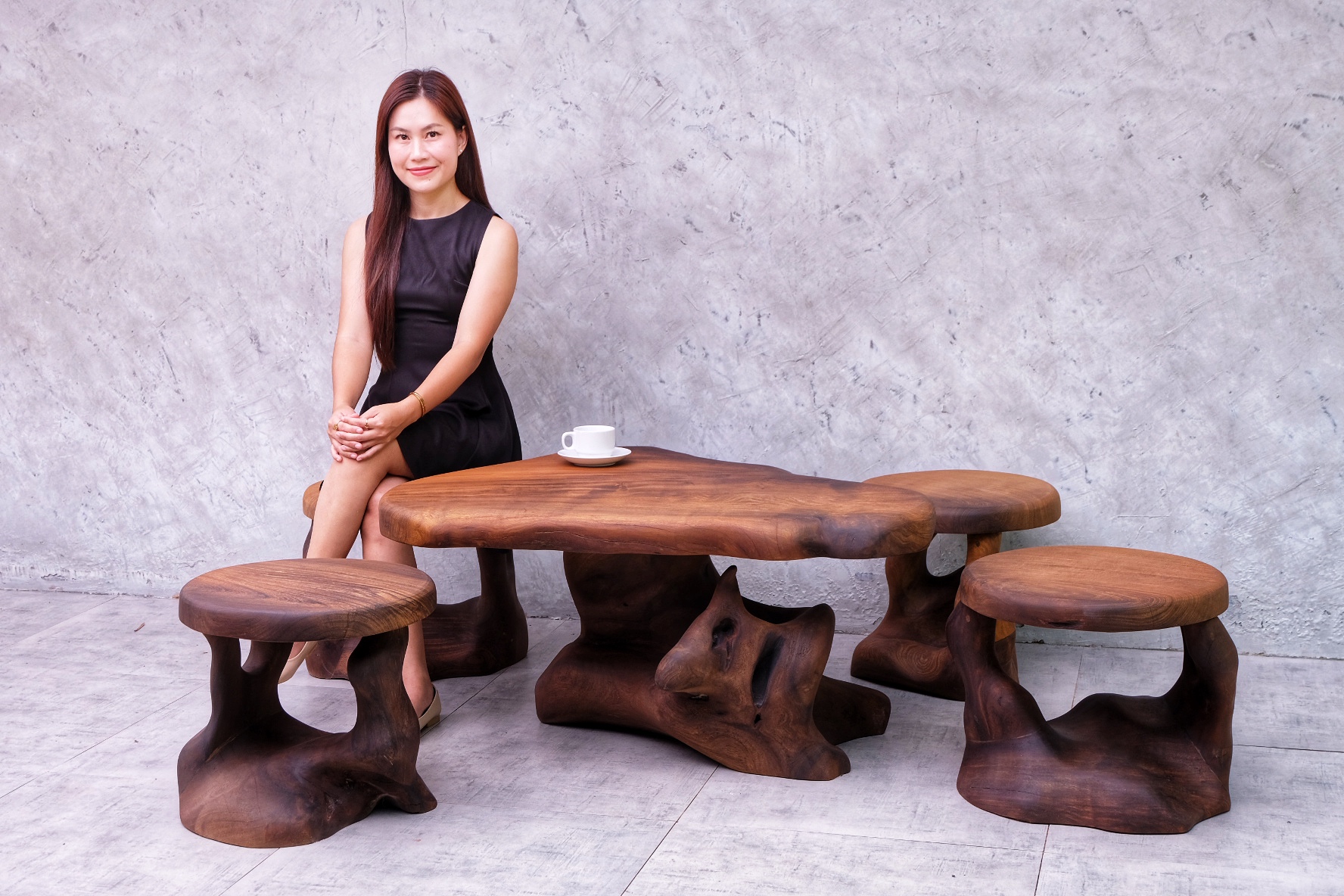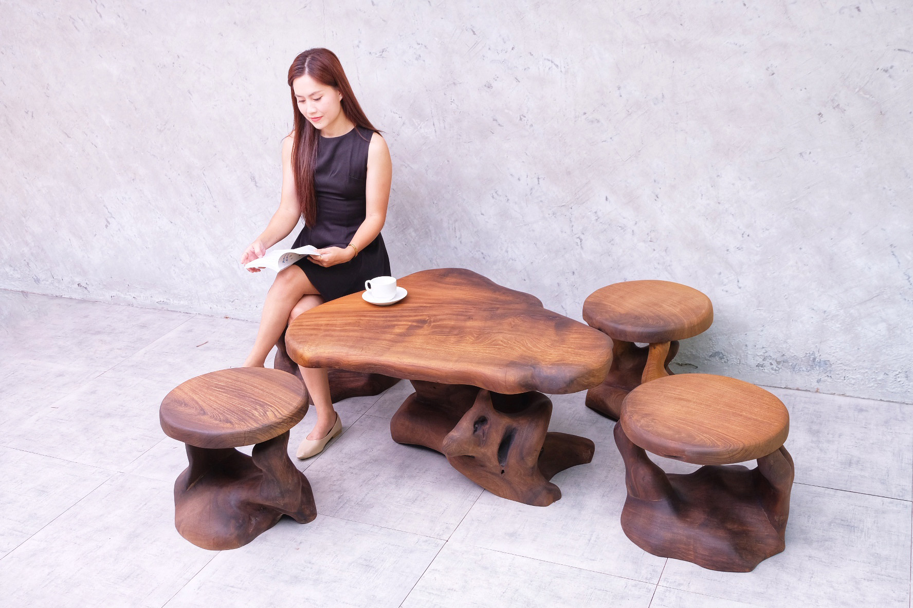 "ชุดโต๊ะไม้" ขนาดกระทัดรัดพร้อมม้านั่งเล็ก 4 ชิ้น เหมาะสำหรับมุมชากลางสวนหรือระเบียงพักผ่อน โครงสร้างของโต๊ะและที่นั่งออกแบบตามรูปทรงเดิมของรากไม้ ขัดแต่งเพียงพอให้สัมผัสเรียบลื่น แต่ยังคงความดิบที่งดงามแบบไม่ปรุงแต่งมากเกินไป เติมเต็มบรรยากาศแห่งความเงียบสงบและเป็นธรรมชาติได้อย่างน่าประทับใจ